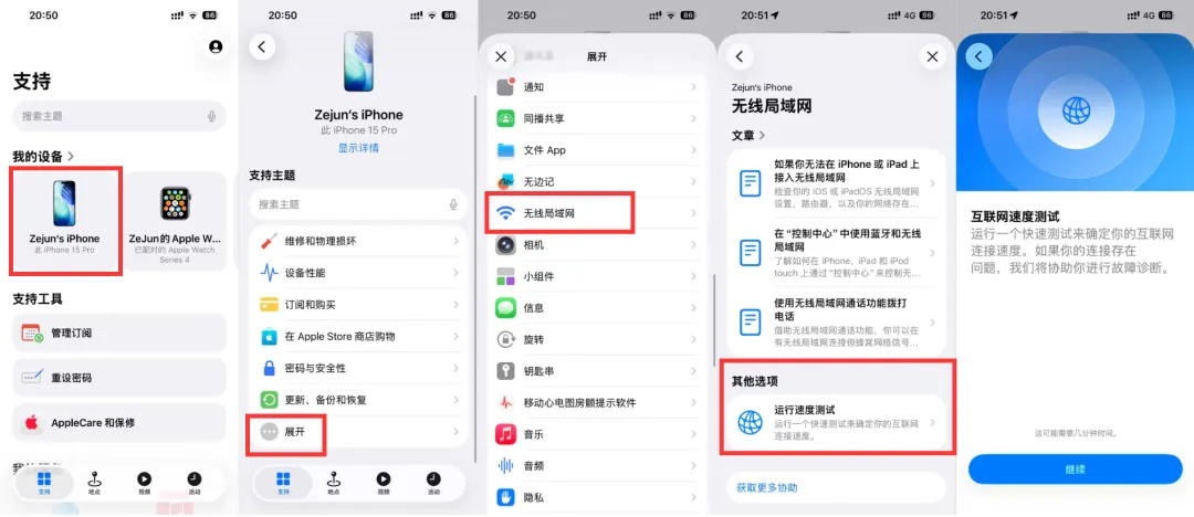 1.选择你的 iPhone/iPad2.再点展开3.下滑找到 「无线局域网」4.点 「运行速度测试」