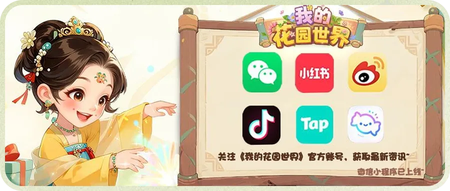 以上是我的花园世界官方带来的最新内容!想体验模拟经营、种花养成的治愈玩法,快来打造你的梦幻花园,种虚拟繁花、收获真实鲜花吧!去各大平台锁定我们官方账号,还能及时获取游戏资讯、活动与福利,千万别错过哦!