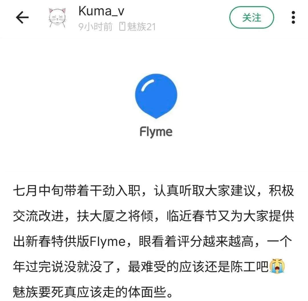 陈工确实是不错的产品经理,如果魅族这次倒下了,我觉得陈工是最亏的,很多人都在替他感到不甘。