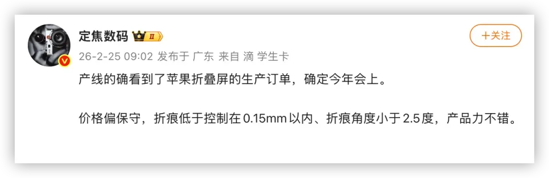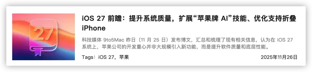 时间即将步入 3 月,是时候让我们来关注 iOS 27 的前瞻动态了。不出意外的话,今年的 WWDC 全球开发者大会仍将落地 6 月。届时,包括 iOS 27、iPadOS 27 和 macOS 27 在内的新系统,都将悉数亮相。目前来看,iOS 27 多半不会是一次以新功能为主的系统迭代。据消息人士 Mark Gurman 透露,iOS 27 将聚焦「性能优化」。具体来说,苹果将在三个方面对 iOS 27 进行优化:Mark Gurman 表示,随着这次优化工作的推进,iOS 27 的整体功耗将迎来显著降低。至少在电池的续航表现上,iOS 27 应该会相当值得期待。众所周知,iOS 26 引入了全新的「液态玻璃」设计。随着界面设计语言的全面升级,随之而来的就是底层优化问题。相信对于不少升级 iOS 26 的用户来说,第一感受就是「卡顿」和「耗电加剧」。尤其是对于一些旧版 iPhone 而言,甚至还会遇到异常发热的问题。但即便到了 iOS 26.3,这一情况也仍未完全解决。因此,苹果决心在 iOS 27 中按下「暂停键」,也就不难理解了。除了基础优化之外,iOS 27 中可能还将迎来对折叠屏产品的适配。据 @定焦数码透露,近期在产线中明确看到了苹果折叠屏设备的生产订单。结合此前多方消息来看,折叠屏 iPhone 基本可以确定将定档今年 9 月。按照该博主的说法,折叠屏 iPhone 的折痕可控制在 0.15mm 以内。同时,折痕角度小于 2.5 度,整体产品力相当不错。不出意外的话,折叠屏 iPhone 将运行 iOS 系统。但考虑到其异形屏幕尺寸,苹果要做的适配工作显然不少。根据此前外界传出的消息,苹果将「优先开发专门针对新形态设备的软件功能」。虽然具体功能尚未公布,但结合折叠屏产品的主要定位来看,新功能多半会聚焦生产力方面。苹果为充分利用其更大的屏幕空间,可能会引入更强大的窗口管理和多任务处理功能。