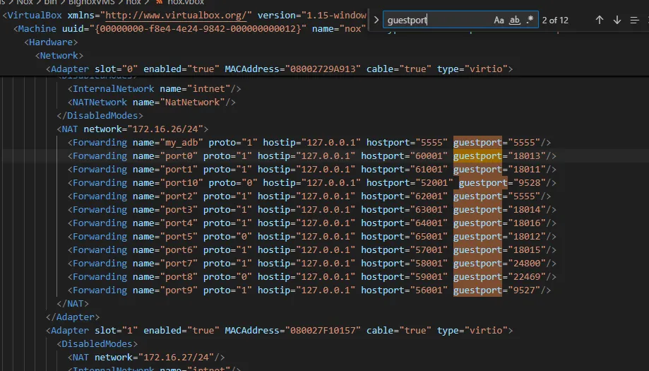夜神模拟器安卓12版本,adb连接端口为62001,为了使用appscan做隐私合规审计方便,需要把adb连接端口改为5555,首先完全退出夜神模拟器,把有关的进程全部结束。根据网上查到的资料,可以修改D:\xxx\Nox\bin\BignoxVMS\nox目录下(模拟器安装目录)的vbox文件,我这里的环境是nox.vbox文件,使用vscode打开文件,查找guestport,如下图所示(my_adb是我后来修改的)
