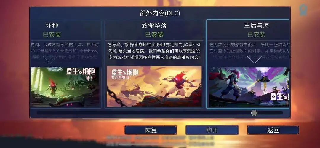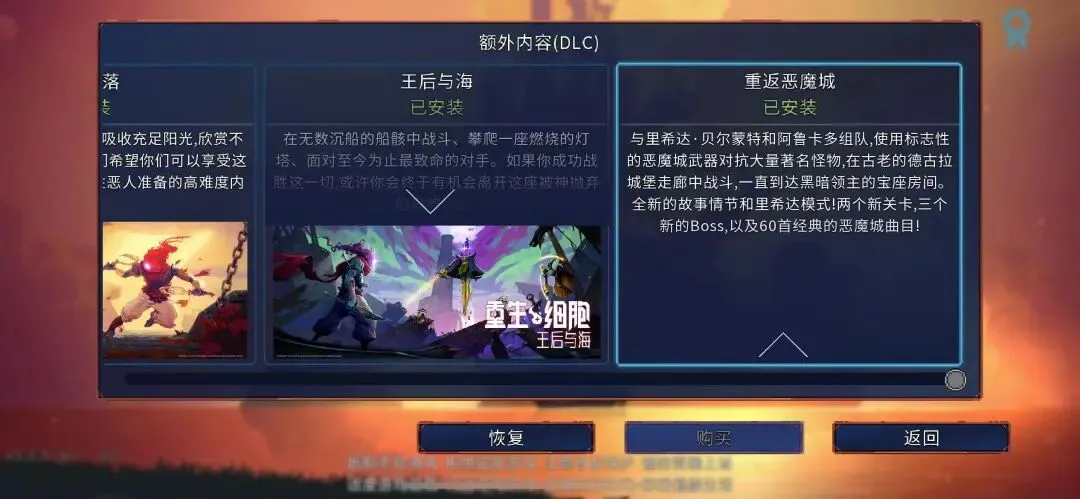 游戏已解锁DLC:坏种+致命坠落+王后与海+重返恶魔城