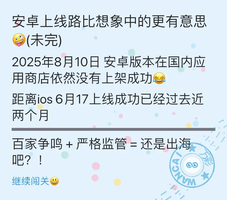截至2025年8月10日 安卓版本在google play已完成上架,但是在国内安卓应用商店依然没有上架成功。