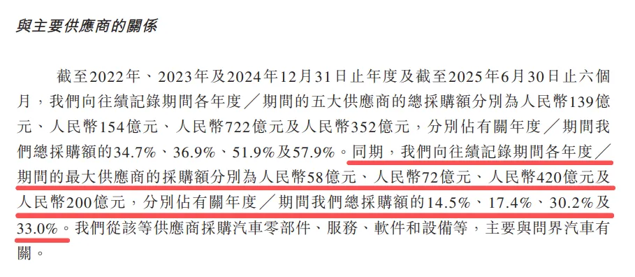 赛力斯在招股书里就说了,华为长期以来都是它的最大供应商,从 2022 年到 2025 上半年,赛力斯对华为的采用费用逐年递增,分别是 58 亿、72 亿、420 亿和 200 亿,加起来到达恐怖的 750 亿。
