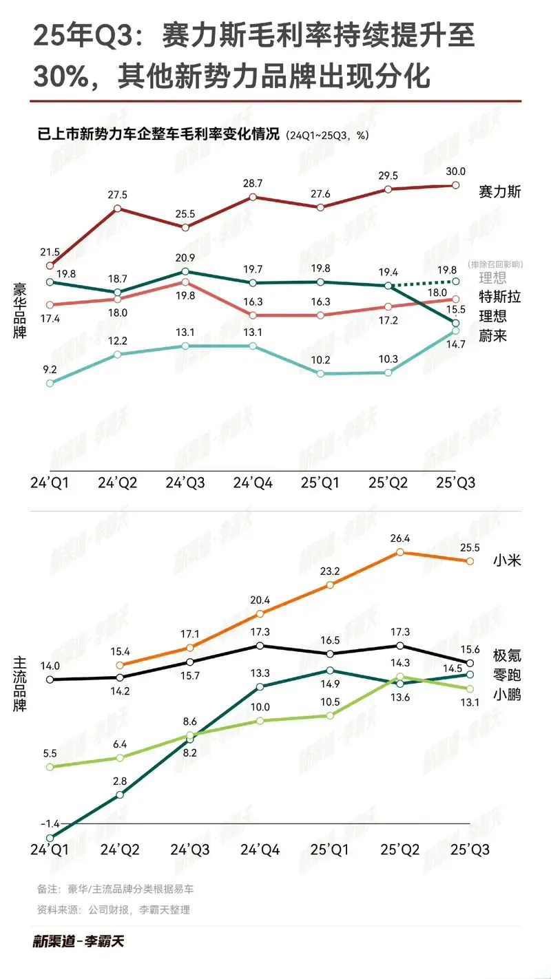 要知道,目前大多数新势力品牌的毛利率,都在 10-20% 之间,比如特斯拉是 18%,理想在 20% 左右,蔚来则只有 14.7% ,和它们比,赛力斯不知不觉就活成了各家车企梦中的样子。