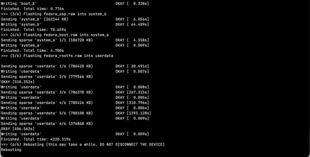 下载并解压后,按住手机电源键和音量减键进入fastboot模式,然后刷入镜像即可。你可以直接按照官方说明操作,不过我在操作时,脚本执行到重启阶段时,手机停留了半小时仍无反应,最后是我手动重启的。
