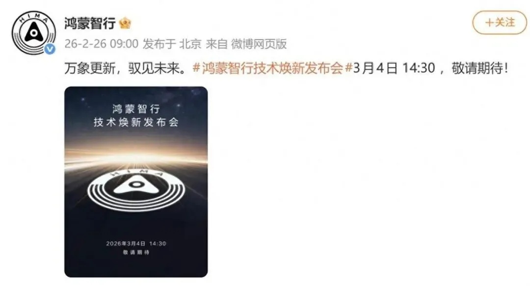 时间来到2026年2月26日,鸿蒙智行一张“万象更新,驭见未来”的海报,再次点燃了行业的期待。 距离3月4日的发布会仅剩一周,各种预测和爆料已经开始在网络上流传。 智能驾驶无疑是本次发布会的重中之重。