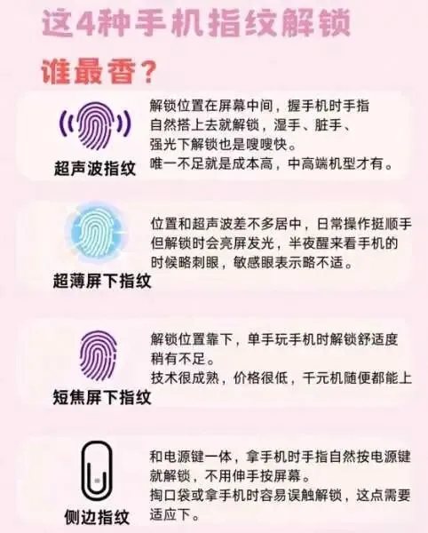 指纹解锁无绝对优劣,核心是匹配自身使用场景与习惯:全场景稳定选超声波,均衡实用选超薄屏下,预算有限选短焦屏下,单手高效选侧边。避开营销话术,按实际用机环境选择,才能获得持久流畅的解锁体验。