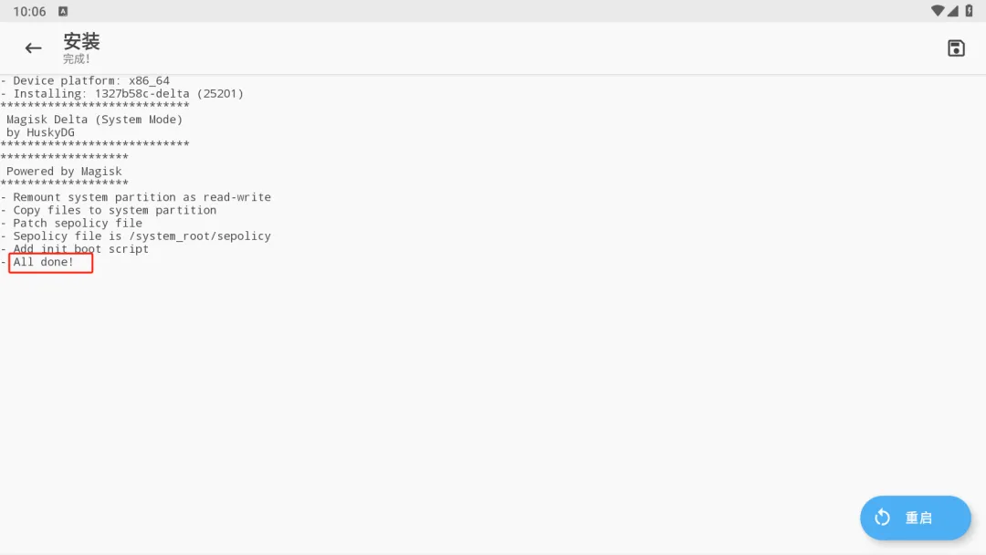 - 安装magisk Delta,再点安装,然后直接切后台退出,再进入安装到系统分区如果失败注意磁盘共享要改为可写入出现All done! 即安装成功。然后直接重启