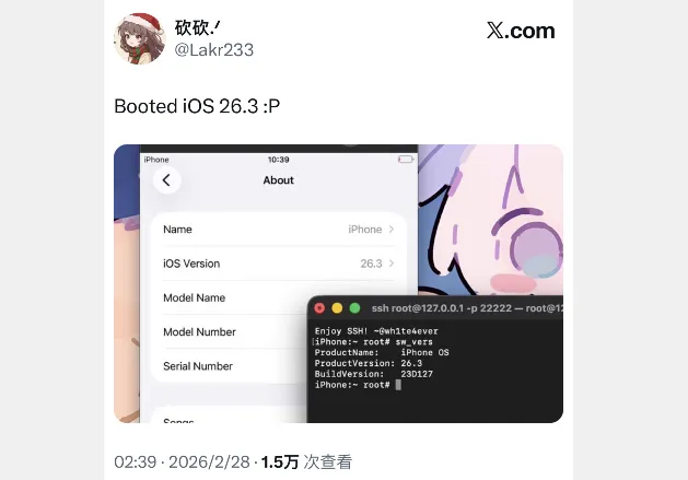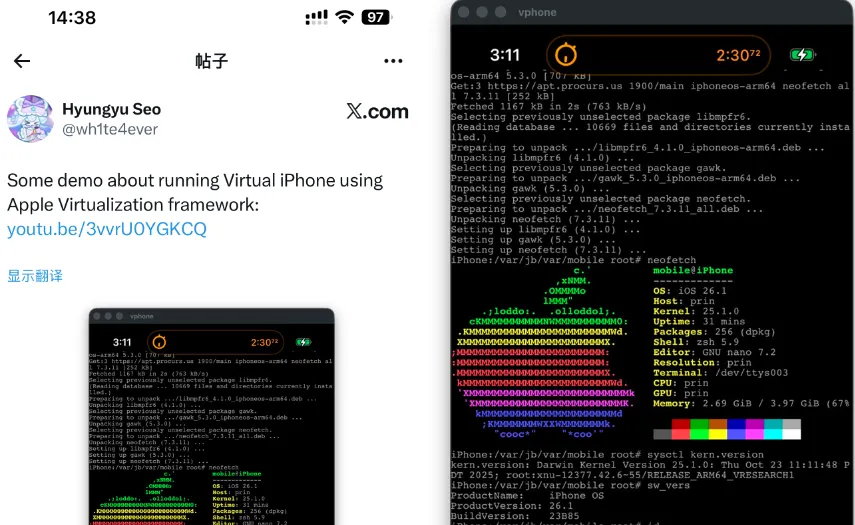 离谱的是,这不影响构建 VPhone 虚拟设备 iOS 升级,在 iOS 26.3 系统上也能实现 root 权限,肯定也能实现越狱,并非一定是 iOS 26.1 系统。