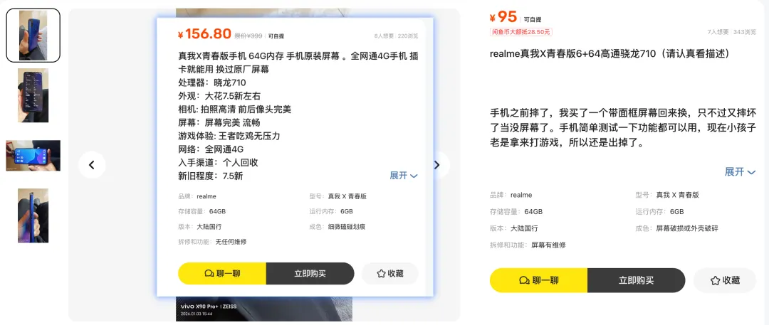 续航是衡量备用机的重要标准,该机标配了4050mAh的电池,配合20W的闪充技术,虽然接口采用了较旧的MicroUSB标准,但充电速度在百元档位依然具有竞争力,在轻度使用下,坚持一整天的待机完全不成问题,最让人惊喜的是它的入手门槛,目前在二手平台,成色尚可的6+64G版本,正常来说价格大致在150元左右,我刷到了一台大残的,价格在95元左右,最最最后总结没啥用不建议入手