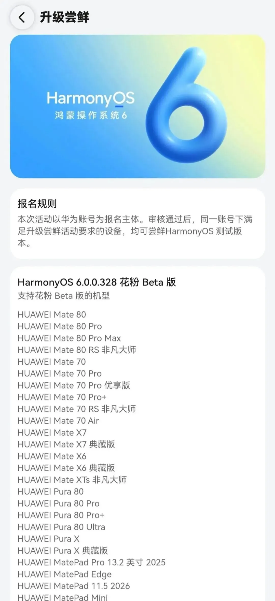 3 月 1 日消息,华为鸿蒙 HarmonyOS 6.0.0.328 花粉 Beta 版昨日开启招募,首批机型覆盖 Mate 80、Mate 70、Mate X7、Pura 80、Pura X、MatePad Pro 13.2 英寸 2025 等系列机型。