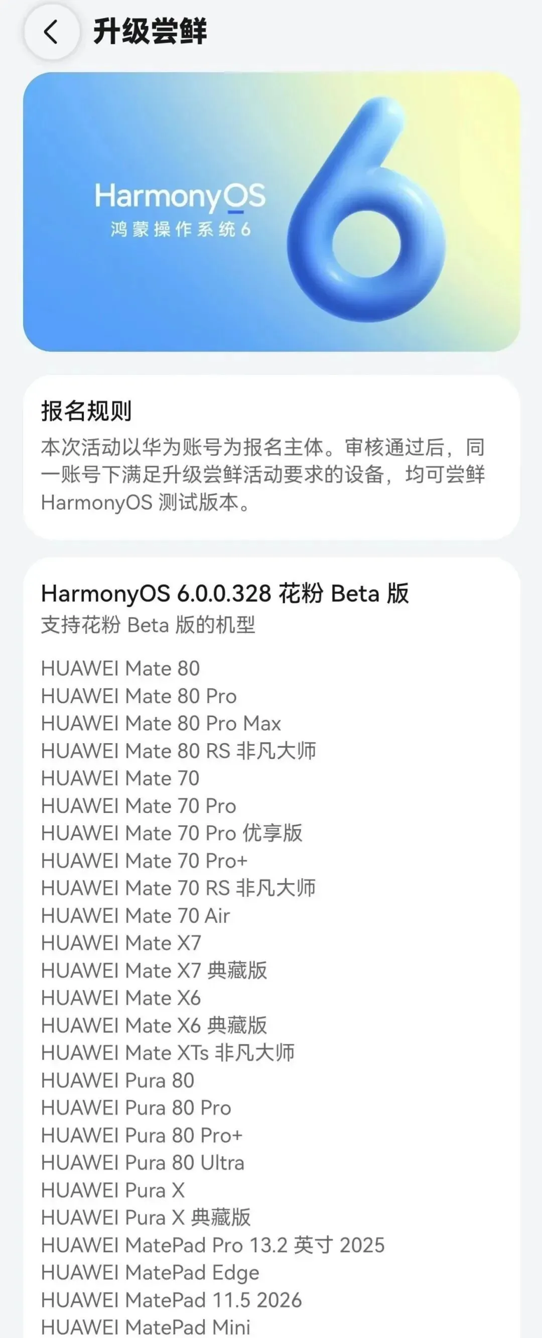 刚刚华为华为鸿蒙 HarmonyOS 6.0.0.328 花粉 Beta 版开启招募,支持25 款机型,包括华为mate80系列/70系列、华为mate x7/x6系列、华为pura 80系列/x系列以及部分平板电脑。