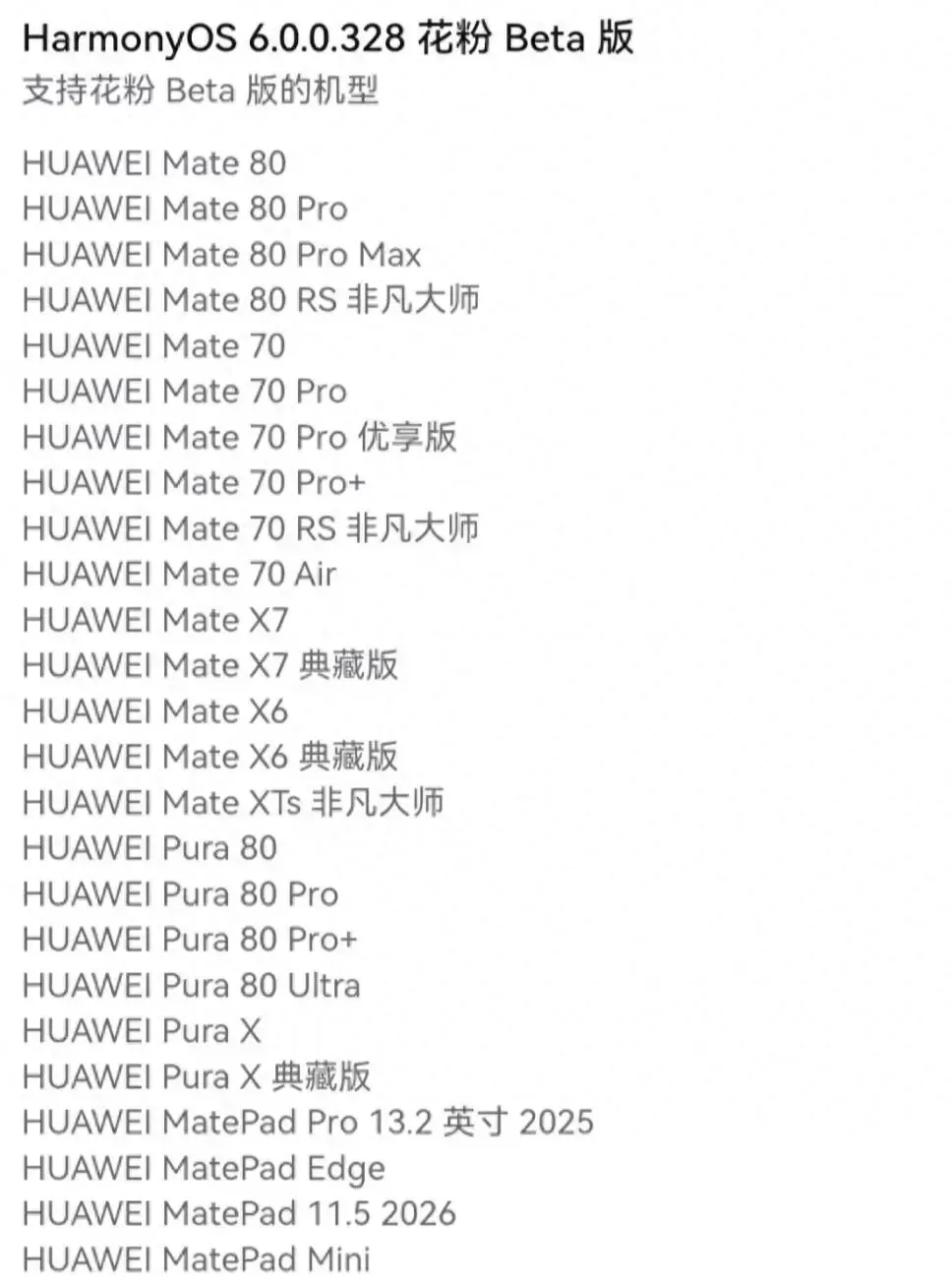 这份名单本身就已经很有看点了。Mate 80系列和Mate 70系列全系都出现在了里面,折叠屏那边的Mate X7、X6还有XTs非凡大师也没落下,Pura 80家族也一个没少。就连MatePad Pro 13.2英寸2025款、MatePad Edge、MatePad 11.5 2026款和MatePad Mini也都被放进测试版里了。从时间上来看,覆盖了两代旗舰产品,价格区间从万元级的折叠屏到平板产品都有,这种覆盖面在鸿蒙之前的Beta版本里确实不多见。