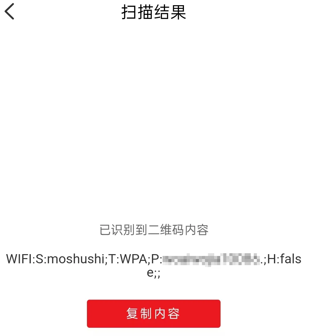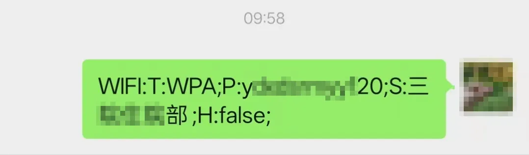 复制后如下图所示,T:WPA代表WiFi的加密类型是WPA,P:后面;S前面是WiFi密码,S:后面是WiFi名称,H:false表示非隐藏网络。同样可以用云闪付app扫码知晓WiFi名称密码。扫码结果见下图,相对微信少了复制文本这一步,一扫描就出结果,可读性和微信一样。