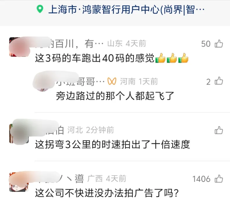 该视频下方,累计上千条评论几乎均为网友的质疑与调侃。有网友直言,“明明是3公里的转弯时速,硬生生拍出了十倍速度的视觉效果”,还有网友打趣道,“转向灯闪得速度快到离谱,一眼就能看出是处理过的”。