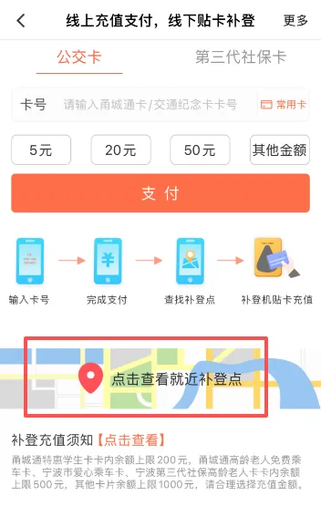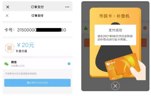 通过"线上支付、线下补登"的方式,提供实体卡充值服务。用户在宁波市民卡APP端或微信公众号输入卡号并完成补登支付后,即可在就近市民卡补登机上贴卡完成补登充值。