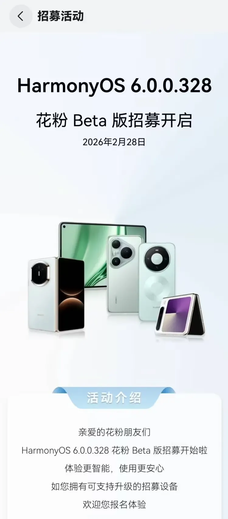 昨天,华为鸿蒙 HarmonyOS 6.0.0.328 花粉 Beta 版开启招募,华为这次动作非常快,今天,已有部分用户已收到该版本的推送。