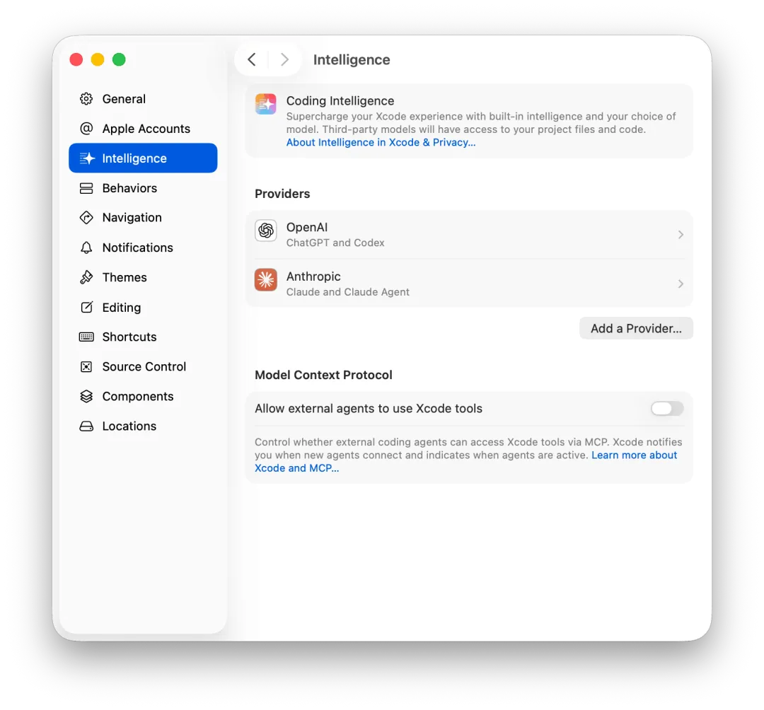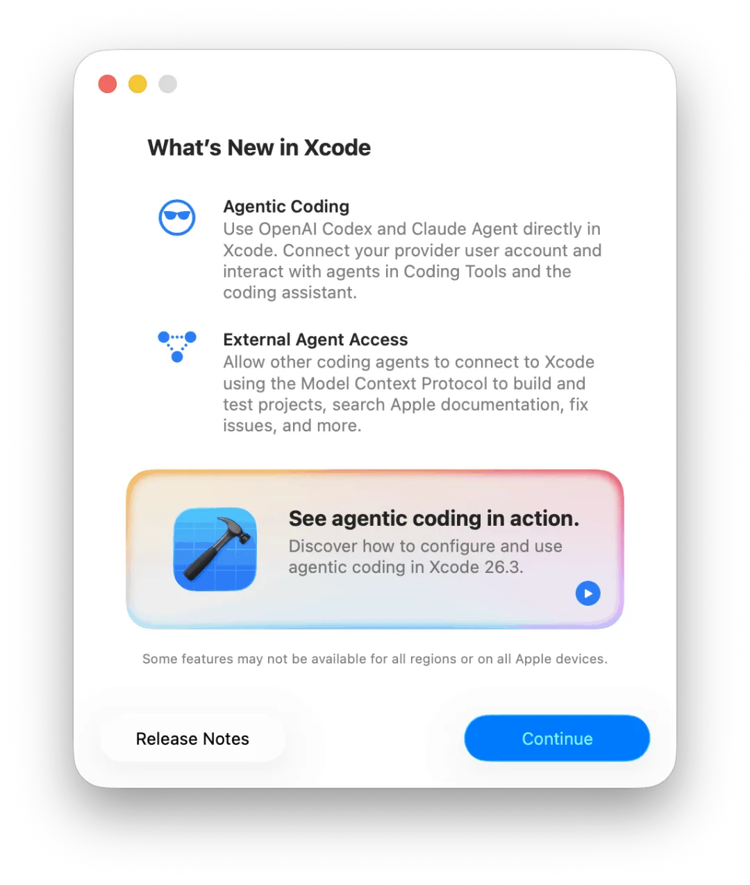 Xcode 26.3 新增了 AI 代理编程(Agentic Coding),可直接在开发环境里使用像 Anthropic 的 Claude Agent 和 OpenAI 的 Codex 这样的 AI 来协助开发。