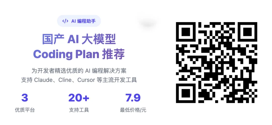 我个人开通了智谱 GLM 和阿里的 Coding 套餐,感兴趣的上方二维码自取。
