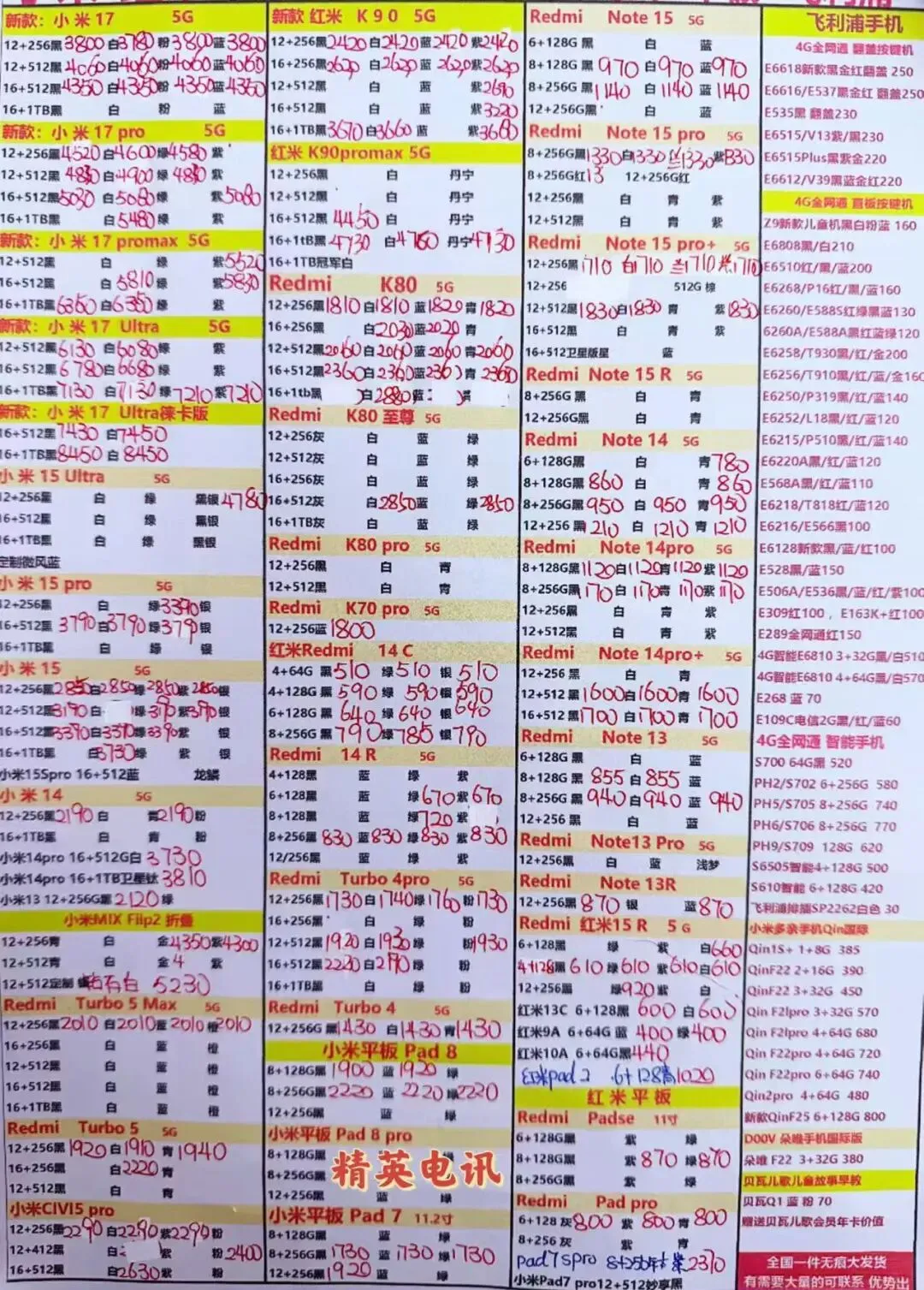 以下报价都是深圳华强北手机批发市场当天的最新批发价格(不含税),报价是我们的批发底价,零售拿货价格需加20~100元不等,京东包邮(量大价格可谈)