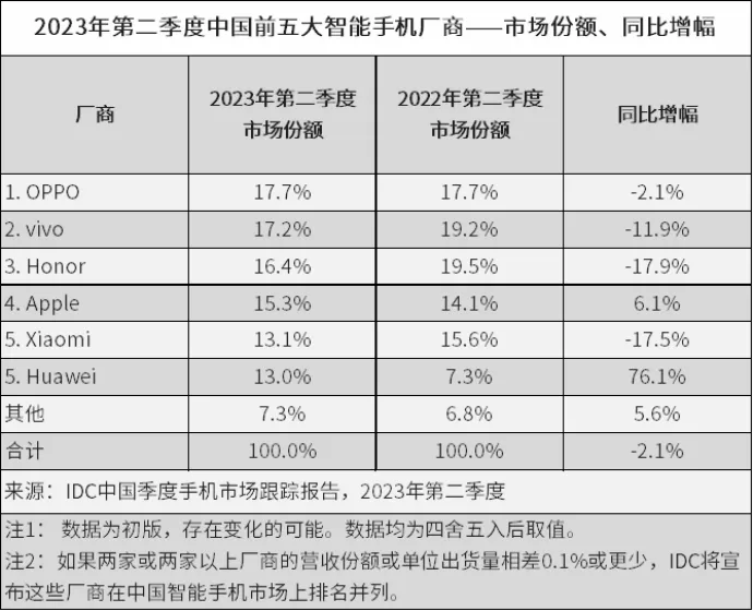 自 2019 年开始,因为非市场原因,华为在中国智能手机市场的份额从 Top1 逐步滑落变成了 Others,然而,就在华为开发者大会 HDC 2023 前夕,在此消彼长之下的市场份额之争下华为智能手机从 Others 中跃出,重回 Top5 之列。