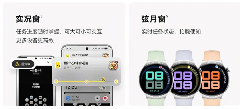 因而我们可以看到非常多的变化,大屏设备上都有的「实况窗」通知,到了小屏设备智能手表,就衍生出了更契合手表产品形态的「弦月窗」,它们形异而神同。