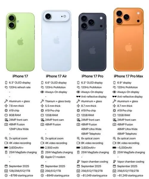 先说价格和版本配置,给还在观望的兄弟姐妹们复习下iPhone17的家谱。iPhone17这代分了三款,标准版、Pro和Pro Max,起步价分别是5999、7999、9999元。存储嘛,128GB起步,顶配1TB(钱包已经在颤抖)。Pro系列用上了苹果A19 Pro芯片,标准版则是A18,内存依旧8GB起,电池容量小幅提升,标配20W快充。说实话,配置这块苹果还是那个“挤牙膏”大师,但毕竟系统生态好,大家还是香。