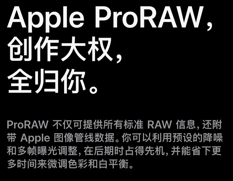 从官网的介绍也能看出,跟普通的 RAW 不同的是,Apple ProRAW 除了保留相片的原始数据,还把算法处理的效果也同时保留,比如降噪、多帧合成等方面的优化。