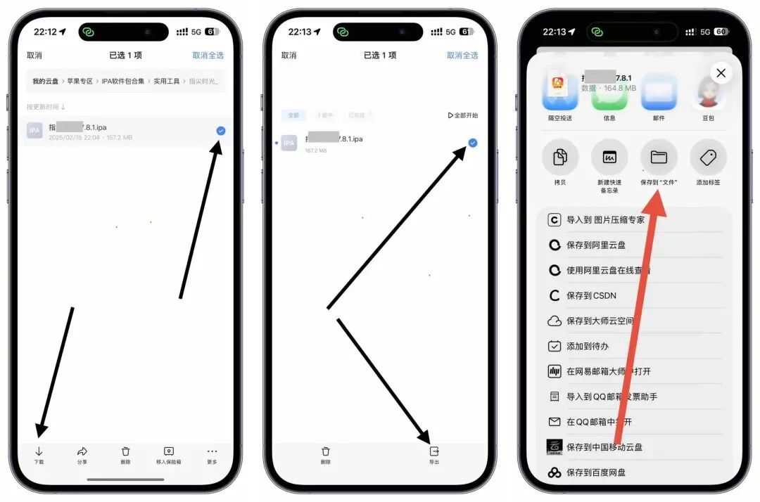 保存到自己网盘后打开自己网盘,点击下载,下载完成,导出,保存到文件,随便测试一个为例