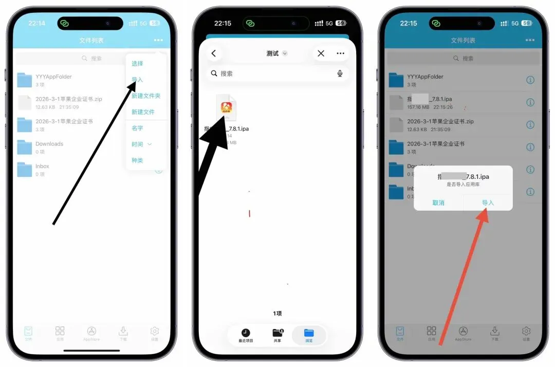 保存到文件后,打开轻松签,首页,右上角三个点,点导入,找到自己下载的IPA安装包,点击即可,点击导入