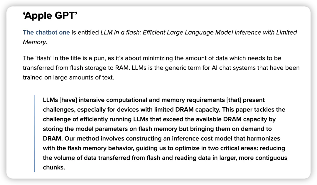 按照 Mark Gurman 此前的爆料,苹果内部对 iOS 18 抱有极高的期望,将带来一些令人瞩目的新功能。综合一些坊间传闻来看,苹果大概率将在 iOS 18 中带来与 AI 技术相关的新功能。近期,一份来自苹果研究人员的论文曝光,为我们透露了苹果关于这项新功能的大致内容。这名隶属于苹果人工智能研究人员在论文中表示,他们已经取得一项重大突破,将通过一种创新的闪存技术,为苹果设备部署大型语言模型。通过这一技术,可以让更智能的 Siri、实时语言翻译以及更多尖端 AI 功能登陆未来的 iPhone。