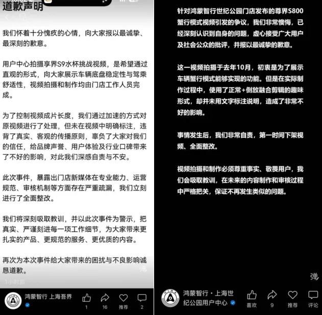 而另一个鸿蒙智行门店鸿蒙智行·上海世纪公园用户中心店也发布道歉声明表示,尊界S800蟹行模式视频拍摄于去年10月,目的为了展示蟹行功能,使用了混合剪辑的趣味形式,造成了不好影响,已下架视频并全面整改。