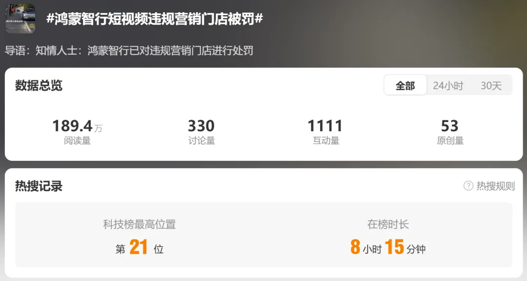 3月2日,一则#鸿蒙智行短视频违规营销门店被罚#的话题冲上热搜,将这家以“黑科技”形象深入人心的品牌推向了舆论的风口浪尖。事件的导火索源自两条看似普通的营销短视频:一条展示车辆平稳通过减速带的视频被网友发现,实际时速仅为3-4公里,且转向灯闪烁频率被人为加速了5到7倍;另一条展示尊界S800“蟹行模式”的视频,则被逐帧分析后发现是将车辆驶出车位的画面进行了倒放处理。为了在激烈的市场竞争中吸引眼球,部分门店选择了一条“捷径”,却最终“聪明反被聪明误”。