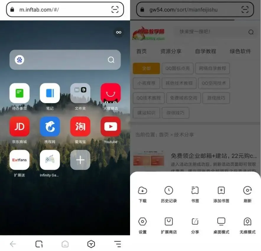 这款浏览器内置Infinity New Tab标签页,颜值超高,而且实用性拉满。你可以自由添加常用的书签到起始页,分类整理,方便快速访问;还能自定义标签页的背景壁纸,选择自己喜欢的图片,打造专属个性化界面。同时,Infinity New Tab支持注册账号同步,在设置里可以修改标签页的语言、使用习惯等参数,换手机或者重新安装软件后,登录账号就能同步书签、标签页设置,不用重新整理,高效又省心。