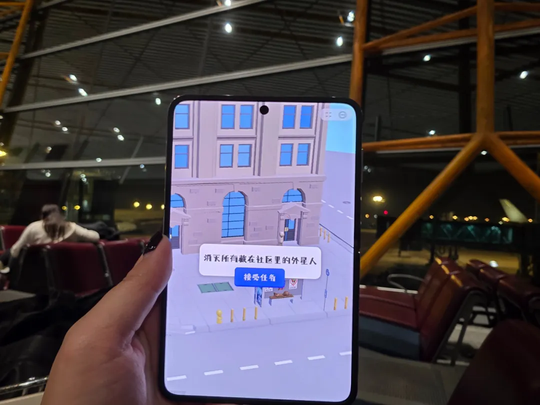 (图注:在机场候机,玩无网小游戏《狙击外星人》)