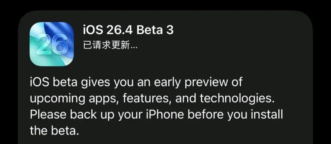 2026 年 3 月 3 日,Apple 正式向果粉们推送 iOS 26.4 Beta3,版本号:23E5223f。