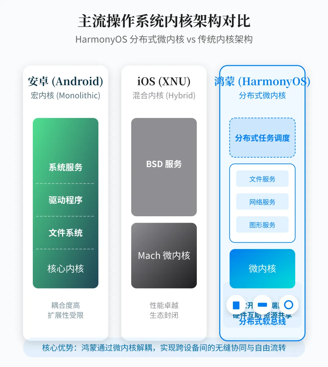 谁能想到,一款不足十年的国产操作系统,竟然在2026年实现了逆袭。鸿蒙OS 以17%的中国市场份额,超越iOS排名第二位,鸿蒙的原生设备装机量超4000万台,生态总设备突破12亿台。从而从备胎的位置蜕变为全球第三大移动操作系统,鸿蒙打破了安卓和iOS的垄断,形成了三足鼎立的局面。鸿蒙设备的爆发,早已不是华为单一品牌的胜利,他是中国科技自强自立的重要标志或者是重要的里程碑。# 鸿蒙6.0:老机型的性能救星对于持有华为老款手机机型的用户而言,鸿蒙6.0,堪称是老机型的救星。他将彻底打破系统升级,只服务新机的固有认知,目前鸿蒙6.0已全面推送覆盖近百款老机型。方舟引擎重构带来百分之25%到40%冷启动速度提升。鸿蒙刚刚发布的时候产生种种质疑,很多人说他是安卓的套壳。有这种误解也可以理解,因为侯鸿蒙5.0之前的系统,可以直安装接使用安卓的应用程序和它的生态,误解它的人说鸿蒙只是换了一层壳的安卓而已。直到鸿蒙next的发布和原生鸿蒙的爆发,才让用户退去安卓系统变种这种误解。鸿蒙的技术差异与优势主要体现在,与安卓的宏内核和i OS的混合内核不同。鸿蒙系统采用的是分布式微内核框架。一次开发多端部署,可以大幅提升开发效率。相较于安卓是第三方中转i OS封闭同步的协同模式,鸿蒙的跨设备体验更流畅。手机汽车穿戴设备联动这种技术壁垒,让鸿蒙在全球操作系统赛道中走出了独特的路径。鸿蒙目前最大的短板在于其生态,很多应用还未开发,而那些国民级应用,如支付宝、微信、抖音、淘宝等虽然均已完成适配,但是也存在一些短板或者功能存在阉割的情况。鸿蒙生态的爆发式增长。是鸿蒙立足全球的核心底气。截止到目前。鸿蒙生态超12亿台。注册开发者达800万。Open harmony商业版图覆盖智能家居行业汽车、工业、政务等多个领域。我国的工信部也在持续的支持鸿蒙应用的开发,推动生态发展,推动更多优质App上架。形成了用户、开发者、生态伙伴的良性循环,这也是鸿蒙能快速跻身全球手机操作系统前三的关键因素。在鸿蒙系统诞生之前,中国已经产生了很多操作系统,如阿里巴巴的云OS,百度云OS,腾讯TOS,无一例外,都以失败告终。鸿蒙的崛起,从来都离不开国家战略的支撑,更承载着中国科技自主的使命,打破西方封锁与卡脖子。操作系统作为信息产业的大脑,是数字经济的核心基础设施。长期以来,被美国所垄断,而鸿蒙的出现,填补了中国自研移动操作系统的空白,契合中国数字建设与科技自主自立自强的国家战略。工信部带头支持鸿蒙产业发展,让鸿蒙成为推动中国数字化转型的重要力量。鸿蒙不仅带动软硬件产业链的发展,它更有希望成为万亿级市场规模,为中国科技产业所赋能。当前,使用鸿蒙系统的手机品牌只有华为。在未来是否会有新的手机厂商加入鸿蒙,答案其实是清晰的。因为鸿蒙生态的成熟度与影响力还在持续的提升,开源模式降低了厂商的接入门门槛,再加上国家政策导向和市场需求的推动,在不久的将来其他手机厂商加入鸿蒙生产鸿蒙系统的手机可能会成为现实。加入鸿蒙既能够降低系统的研发成本,又能共享鸿蒙生态资源与技术优势。现在已经有很多企业生产的带有鸿蒙系统的白色家电、可穿戴设备形成了多点开花的格局,进一步壮大了国产OS的生态。从鸿蒙立项,从技术追赶再到局部超越。鸿蒙用了不到10年时间,完成了国外同行30年的积累。它不仅仅是一款操作系统,更是承载着,中国科技人不服输,敢突破的精神缩影。鸿蒙的未来或许仍然还有许多挑战,但是随着国家战略的持续加持,生态伙伴的不断加入,技术的不断迭代。打破垄断,自主可控,是一定可行的。让中国的科技力量照亮万物互联的新时代,这是鸿蒙的底气,也是中国科技的未来。