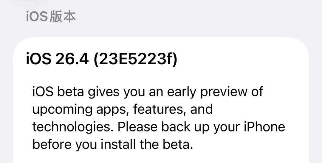 总之,iOS 26.4 Beta 3 主要还是一个以优化为主的小更新,尤其是修复了 App Store 加载缓慢的问题,如果你已经更新了 iOS 26.4 Beta 的话,非常建议更新到这个版本。
