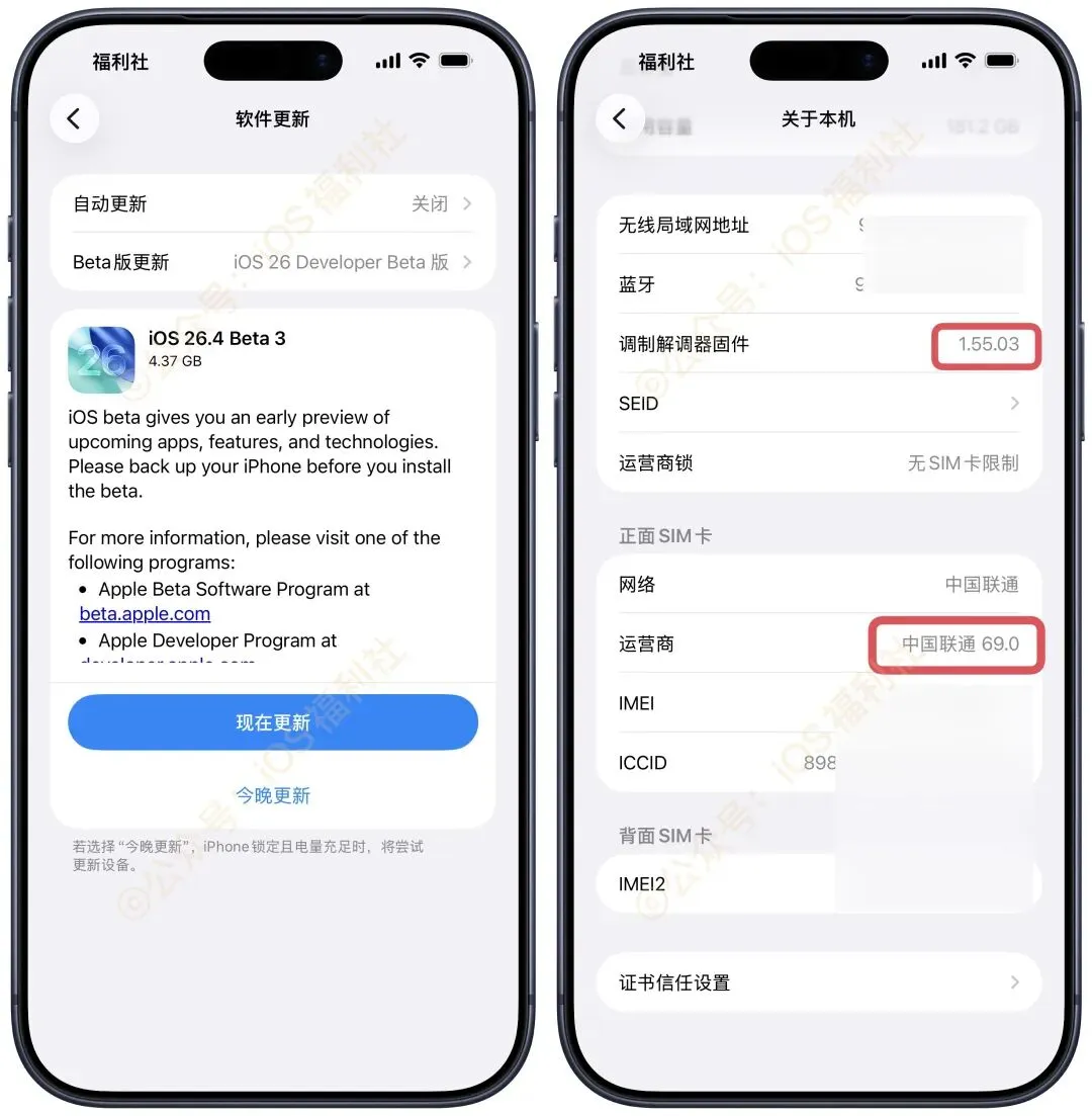 iOS 26.4 Beta 3更新,IPCC更新69.0