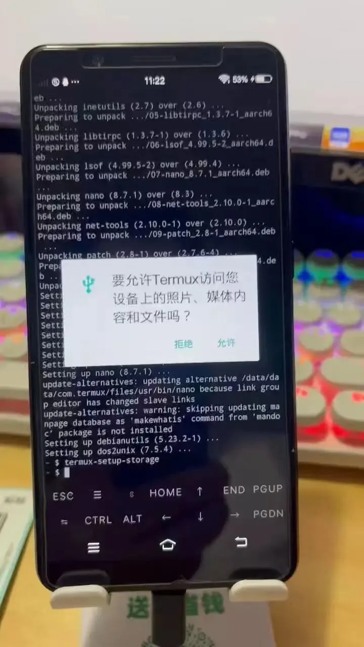 此时手机会弹出权限请求,允许 Termux 访问文件。