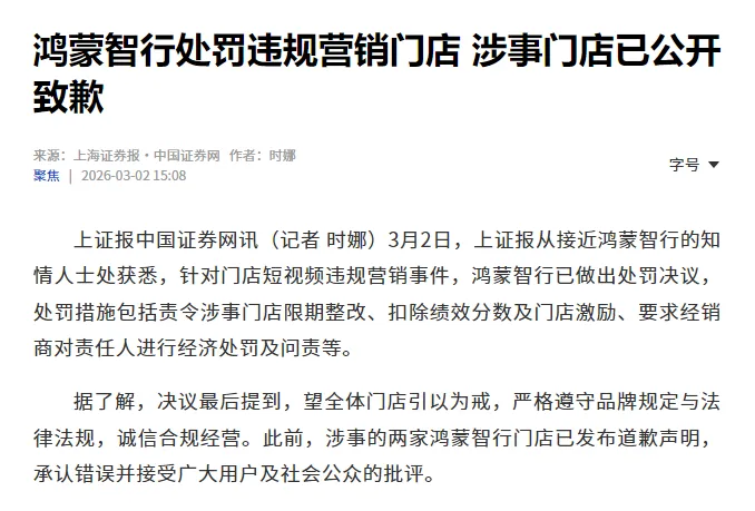 值得一提的,还有鸿蒙智行官方的态度。据财联社3月2日电,记者从知情人士处获悉,鸿蒙智行已对“门店短视频违规营销”事件做出处罚,包括责令涉事门店限期整改、扣除绩效分数及门店激励、要求经销商对责任人进行经济处罚及问责等。