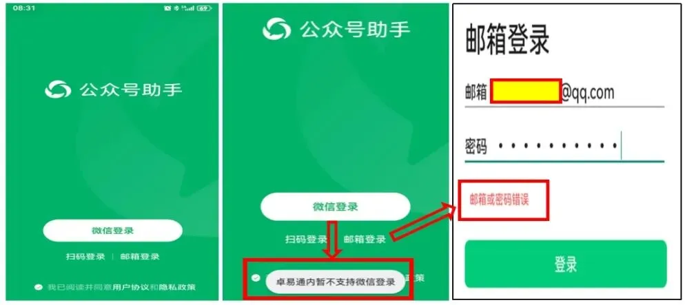 3. 打开“公众号助手”,不要点击“微信登录”,目前还是无法直接用微信账号登录的,点击之后会提示“卓易通内暂不支持微信登录”;也不要点击“邮箱登录”,这样也是不行的,我以为是会和QQ邮箱关联起来,实际是没有的,会提示“邮箱或密码错误”,亲测是不行的。