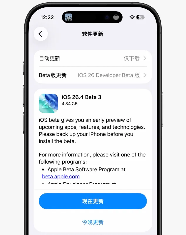 ,已经注册Apple Beta版软件计划的用户只需打开设置--通用--软件更新即可在线OTA升级至最新的iOS 26.4 Beta3测试版。