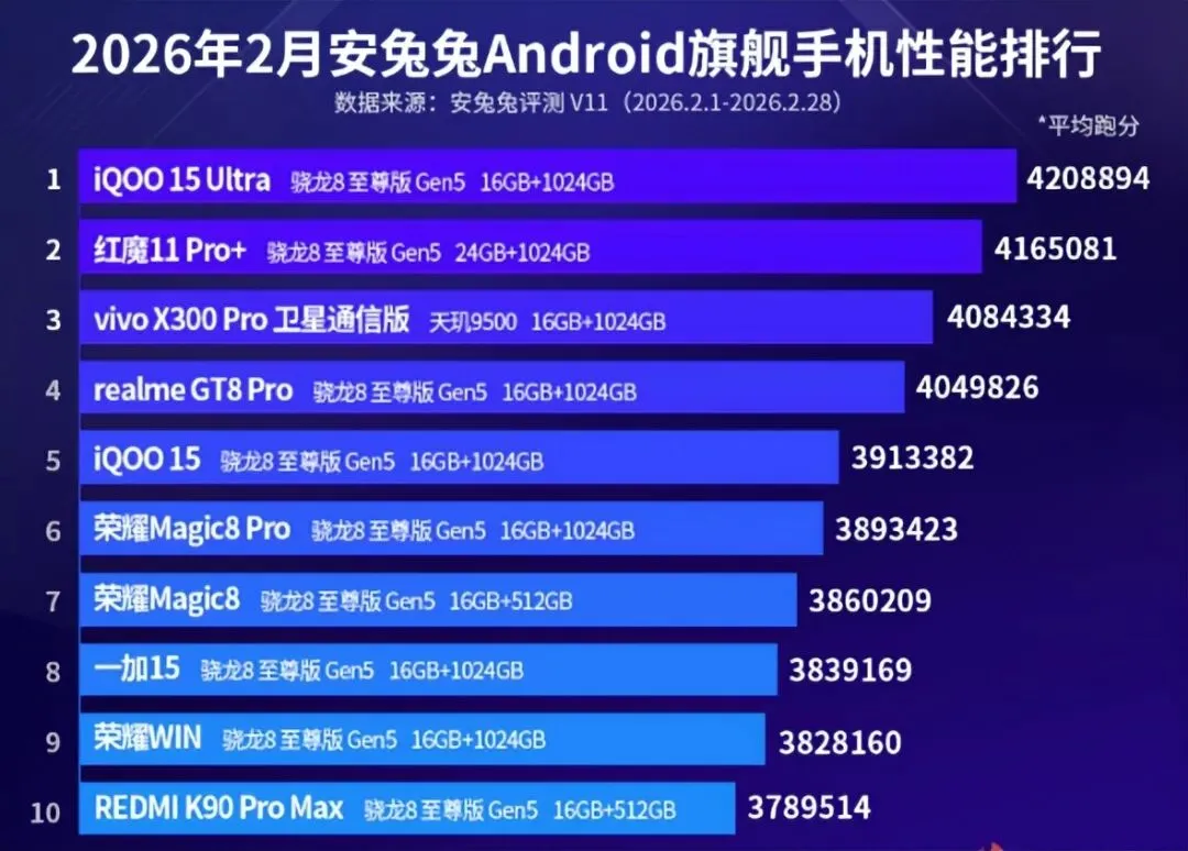2026年2月的安卓性能排行,格局已经非常清晰:400万分成了旗舰门槛,420万分成了新的天花板。