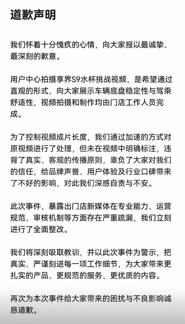 事件发酵后,涉事门店公开致歉,承认运营与审核疏漏,已下架违规视频并整改。鸿蒙智行随后发布处罚,对门店通报批评、扣除绩效与激励、问责相关责任人,多地门店也开始清理同类争议内容。法律人士指出,此类行为涉嫌虚假广告与消费欺诈,或面临行政与民事责任。