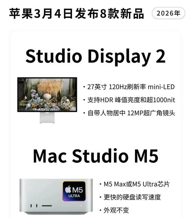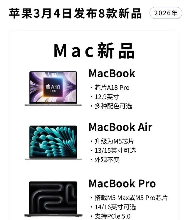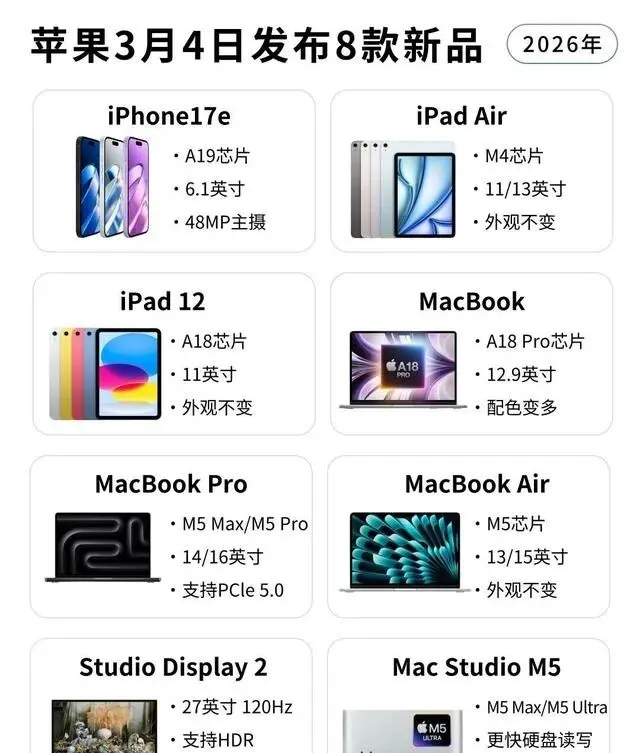 看完这波产品更新,能明显感觉到苹果的思路变了。以前是在保证利润的前提下,严格控制成本;现在是在保证竞争力的前提下,适当放开配置。为什么会有这个转变?机制解释:最直接的原因,可能是整个市场环境的变化。安卓阵营这边,存储芯片涨价的风声一直在传,接下来安卓手机的定价大概率会往上走。这时候苹果如果能把配置拉起来,同时把价格稳住,就等于在对手涨价的时候“按兵不动”,反而显得自己有性价比。用更少的钱买到更强的配置,对消费者的吸引力是天然的。但这里面肯定有取舍。代价1:全系上高配,意味着供应链成本会大幅增加,这部分成本最终要么转嫁给消费者,要么从其他地方省回来。比如边框材质、充电头、数据线这些小配件,会不会又被“环保”掉,现在还是未知数。代价2:产品线拉得太满,自家中端和高端机型可能会互相打架。iPhone 17e如果性价比太高,会不会影响Pro系列的销量?这需要库克在定价上做非常精细的切割。误区澄清1:有人可能会觉得,苹果这次是“良心发现”了。其实更准确的看法是,这是市场竞争倒逼的结果。当对手在某个价位段形成合围时,苹果必须拿出足够有诚意的产品去防守,甚至反击。误区澄清2:也别看到A19、M5就觉得性能无敌。芯片的瓶颈这几年已经不在CPU本身,而在散热和功耗。轻薄本能不能压住高性能芯片的发热,到手实测前都只能算推断。反方观点:也有朋友跟我吐槽,说苹果这次虽然配置给足了,但创新点在哪?还是那些芯片、屏幕、摄像头的升级,没有看到颠覆性的新形态、新交互。他觉得这更像是一次“防守型更新”,而不是“进攻型创新”。读者决策建议:如果你现在正打算换设备,我的建议是:别急着冲首发。3月份发布会开完,等第一批真实用户的体验反馈出来,重点关注发热、续航、软件适配这几个维度。尤其是有专业创作需求的朋友,PCIe 5.0、M5 Max这些参数很诱人,但实际能提升多少工作效率,还得看具体软件优化得怎么样。最后,我也挺好奇大家的态度。这8款新品里,如果只能选一样,你是会冲那个补上MagSafe的iPhone 17e,还是等那台mini-LED屏的Studio Display 2?来评论区聊聊,给其他还在纠结的朋友做个参考。觉得这篇文章帮你省了点时间的话,也欢迎收藏起来,等发布会后对照着看,心里更有数。