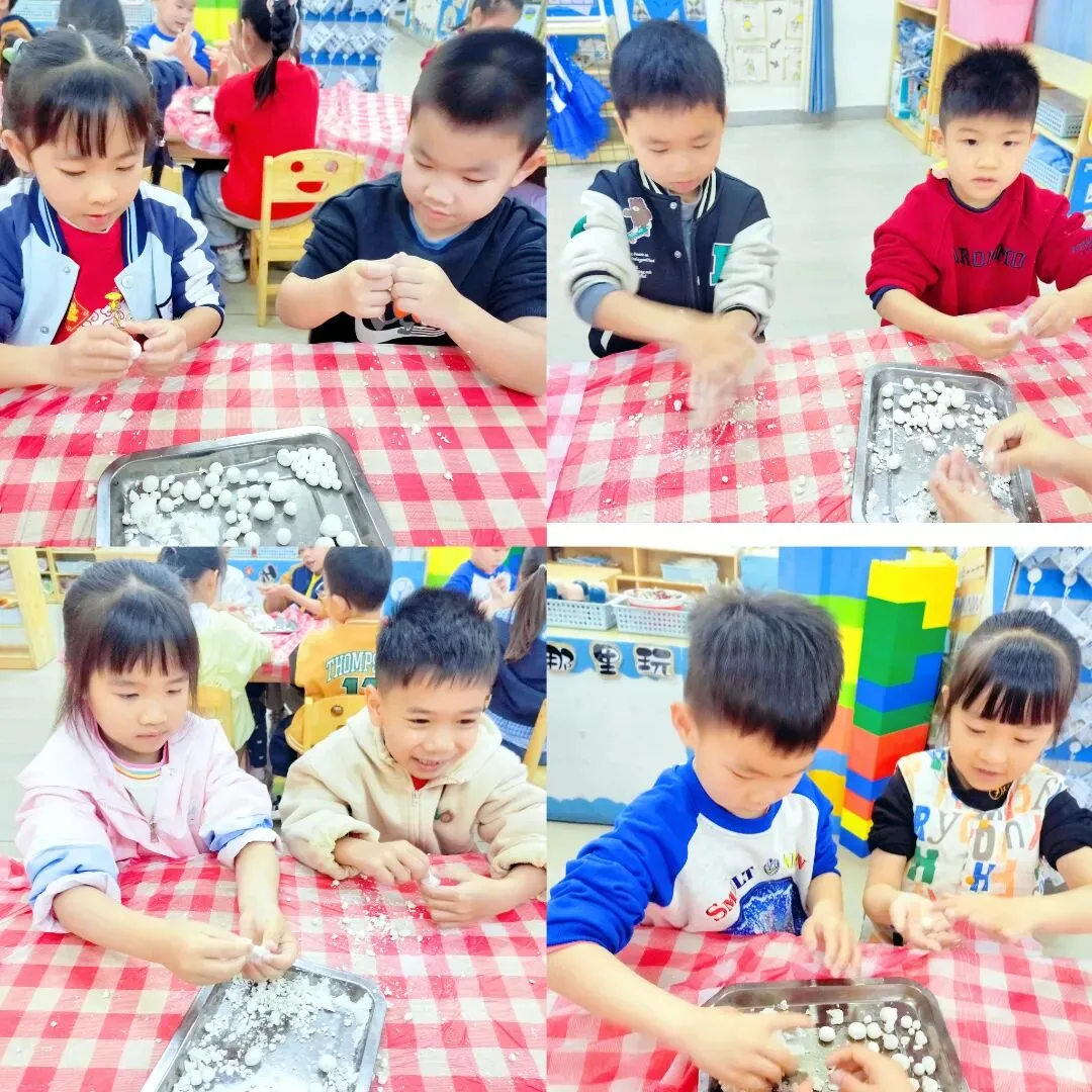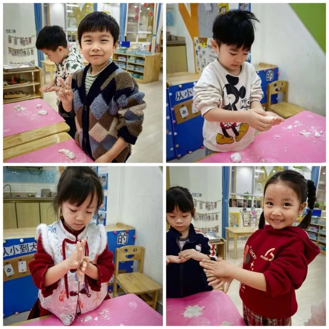 捏一捏,揉一揉,孩子们用一双双能干的小手,将满满的喜爱和祝福滚进了一颗颗甜蜜的元宵里,是不是很厉害呀?瞧,孩子们挽起袖子,动手做元宵咯。
