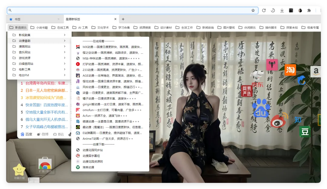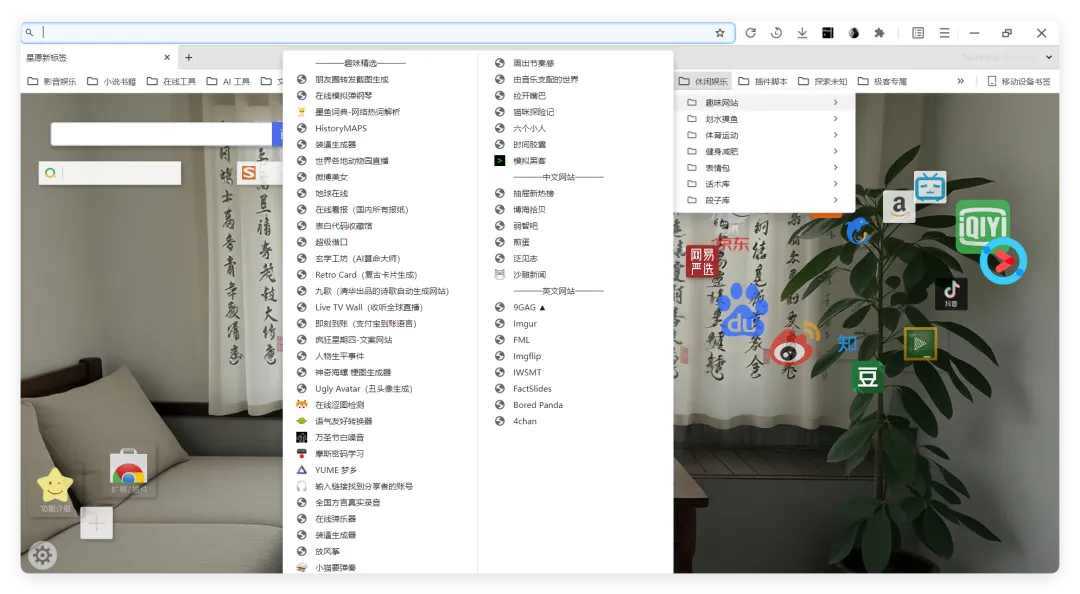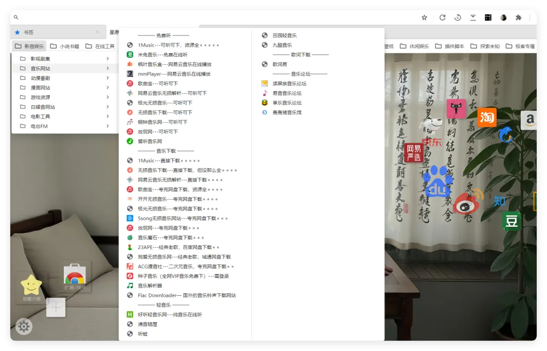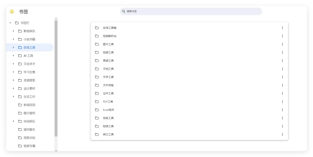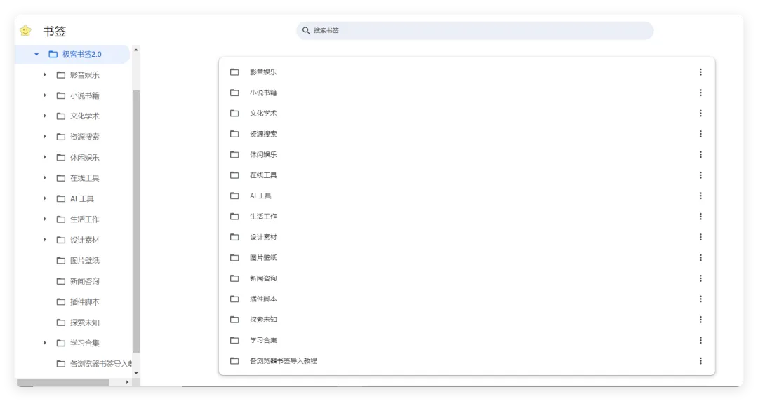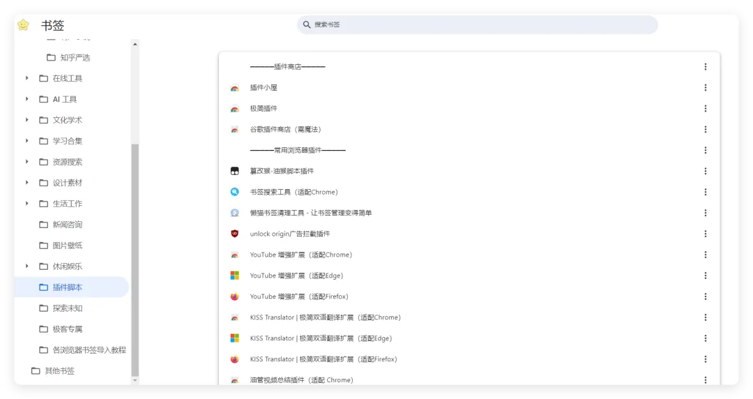 首先是书签类别,新增了插件脚本、学习合集、极客专属三个大类,目前分为了15个大类:在线工具、影音娱乐、资源搜索、AI工具、文化学术、图片壁纸、休闲娱乐、小说书籍、生活工作、新闻资讯、设计素材、插件脚本、学习合集、探索未知、极客专属▼导入浏览器书签栏后